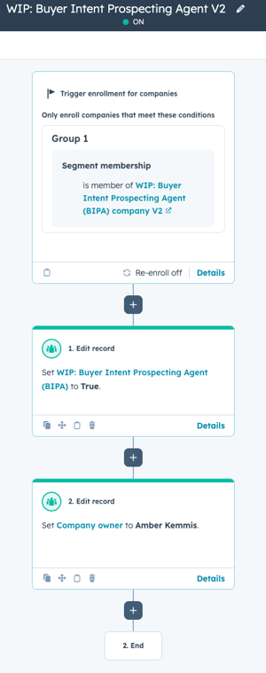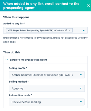 Finally, activate HubSpot’s Prospecting Agent to drive outreach. Set up an automated enrollment rule so that when a contact is added to the Buyer Intent Prospecting Agent contact list, they are enrolled in the Prospecting Agent.