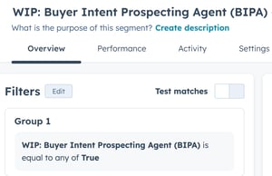 Create active Contact segment “Buyer Intent Prospecting Agent” with the criteria Buyer Intent Prospecting Agent is equal to any of "True" (this will populate via the integration with Apollo)