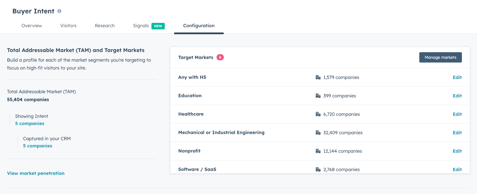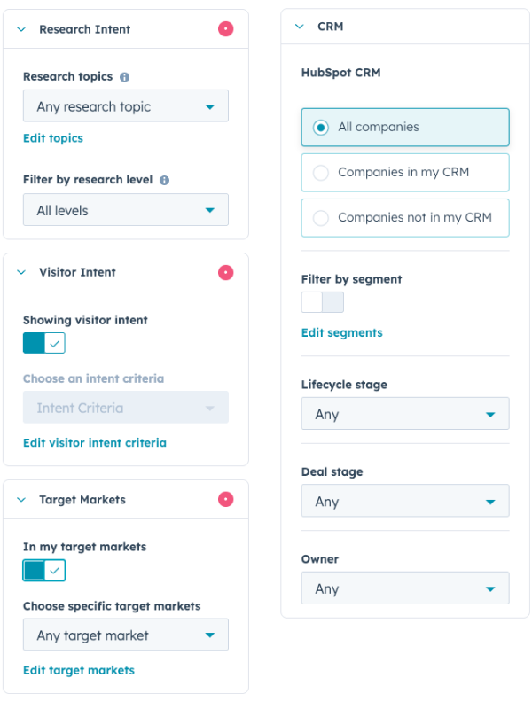 Start by telling HubSpot what “right fit” actually means for your business by creating target markets using firmographic and technographic criteria. These markets act as guardrails, ensuring buyer intent signals are tied to companies you actually want to sell to. HubSpot Knowledge Base article »