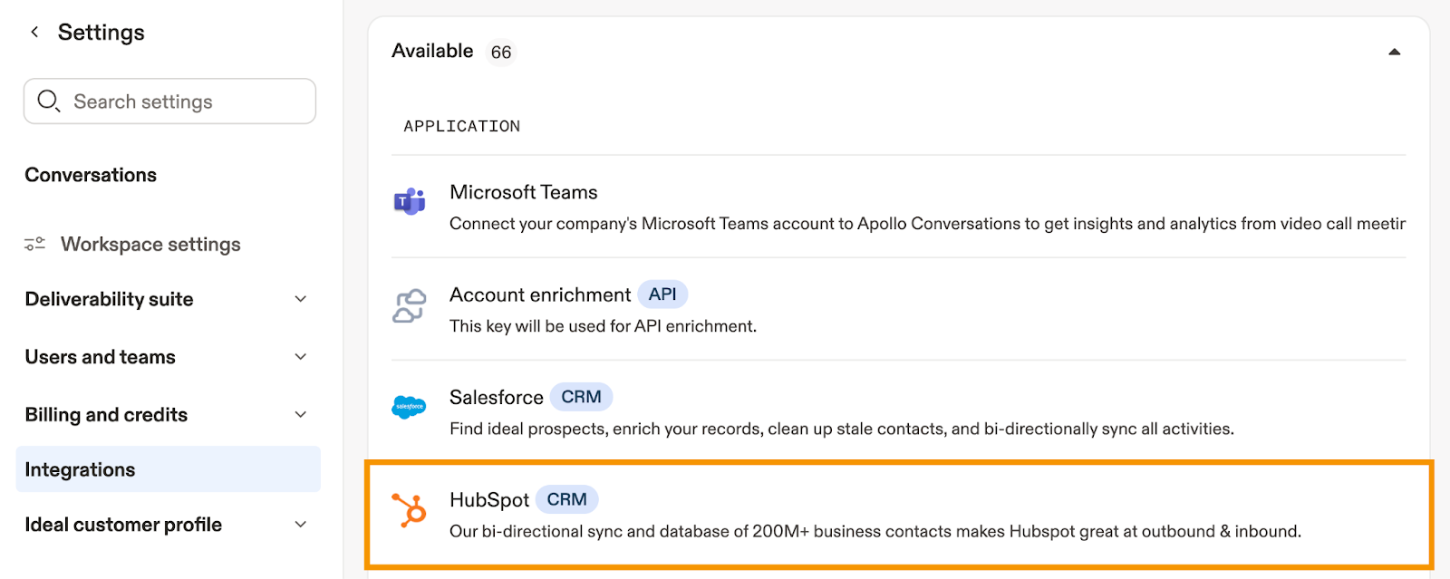In Apollo, go to Settings -> Integrations -> HubSpot.