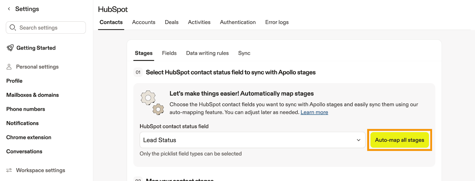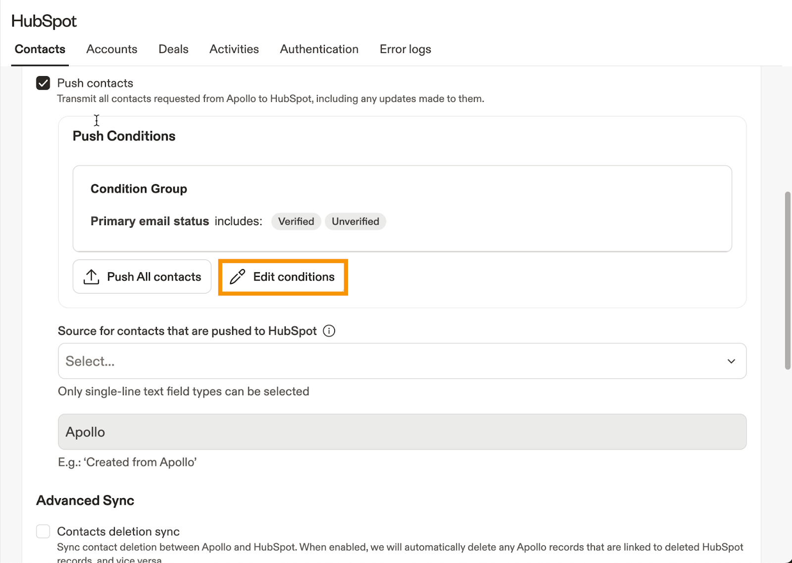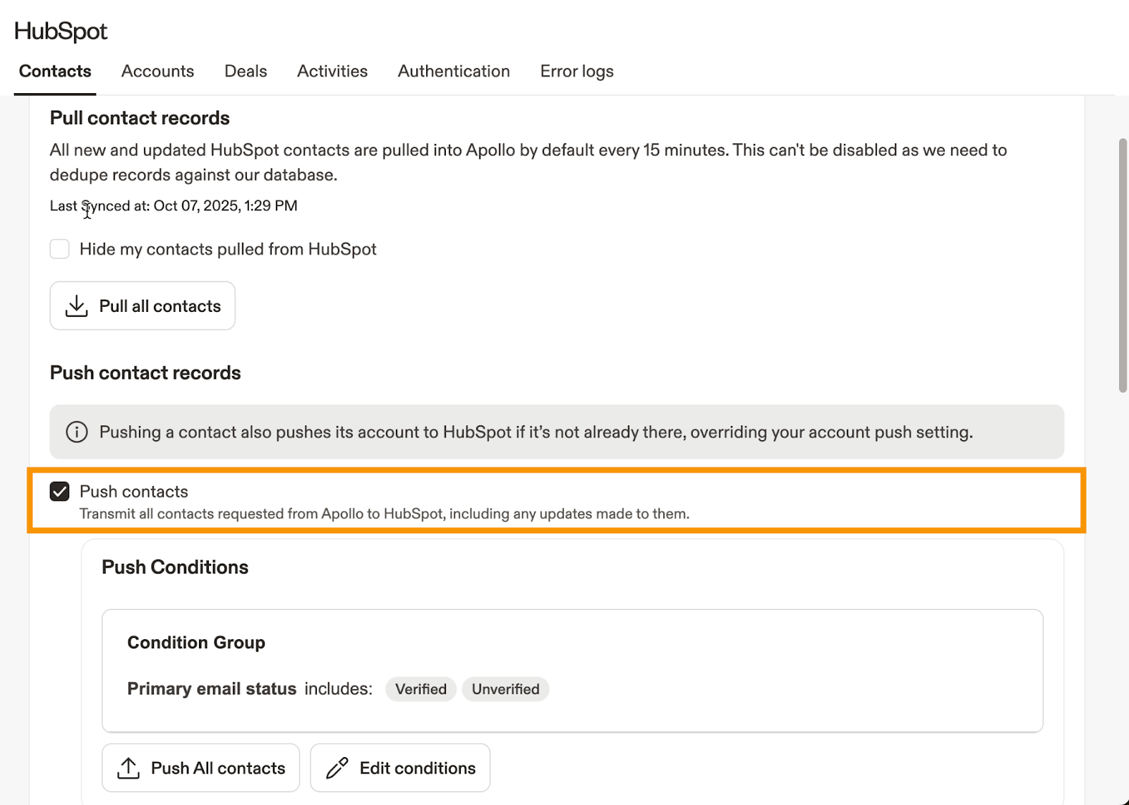 After enabling, click Push all Apollo contacts to HubSpot to push all your existing contacts.