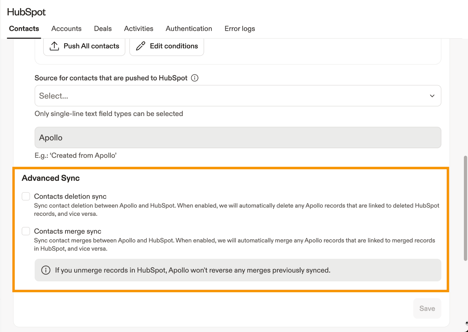 Duplicate records: If you have synced duplicate records in HubSpot or Apollo, there are two sync settings to remove them: