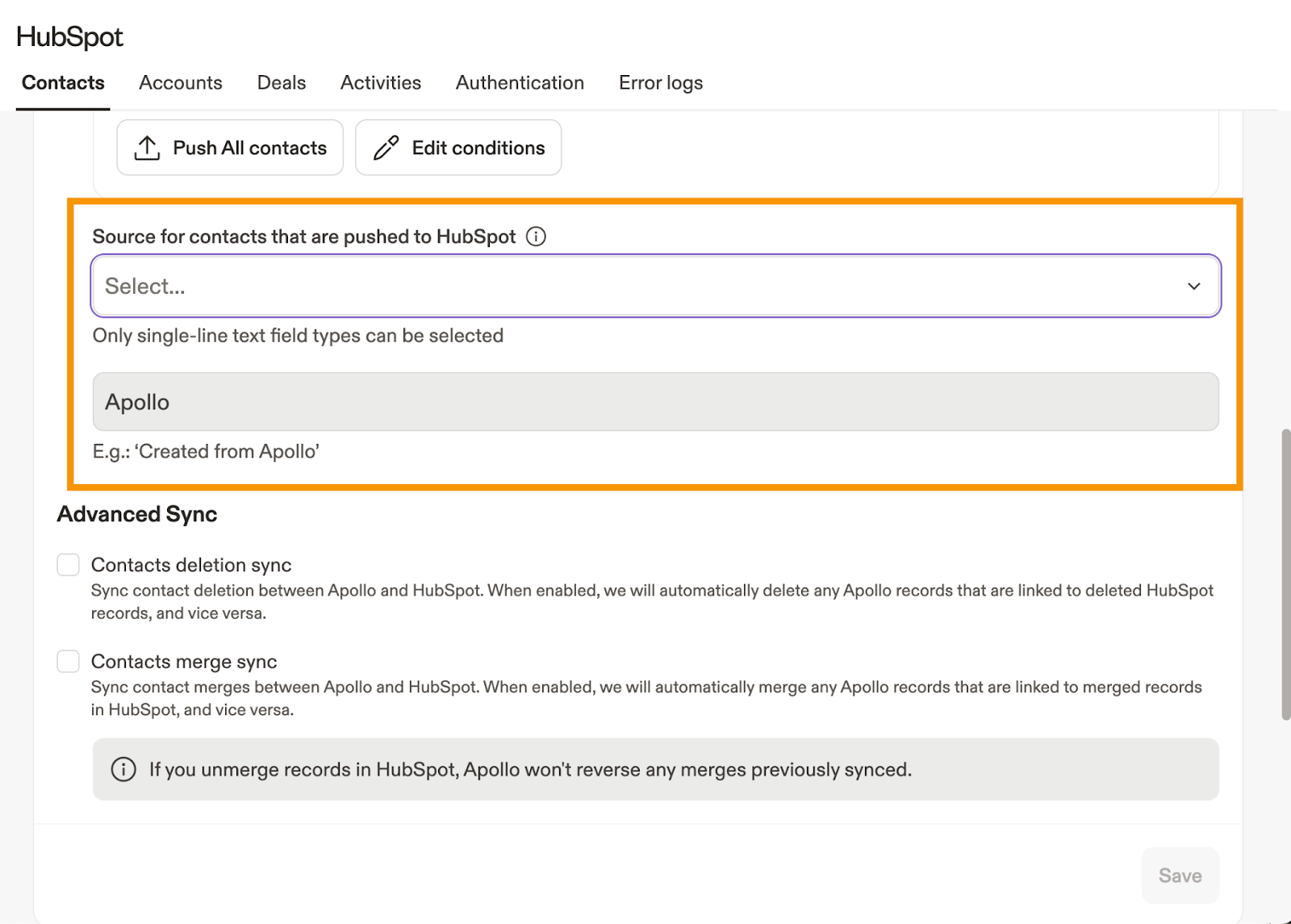 Back in Apollo, set a source for contacts synced from Apollo to HubSpot. The default source is "Apollo."