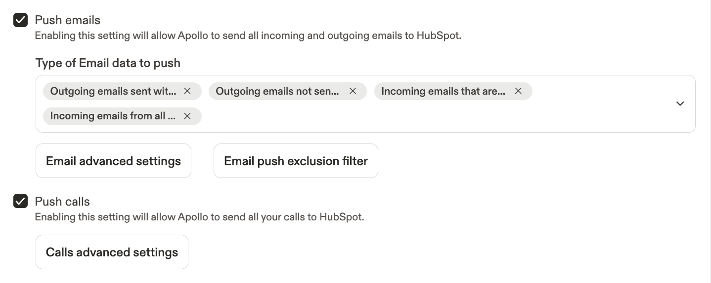 Check Push Calls to push phones calls made in Apollo to HubSpot.
