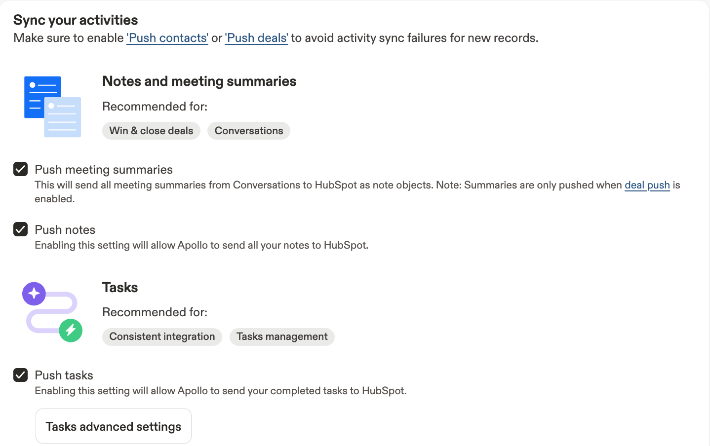 Check Push Tasks to push tasks from Apollo to HubSpot.
