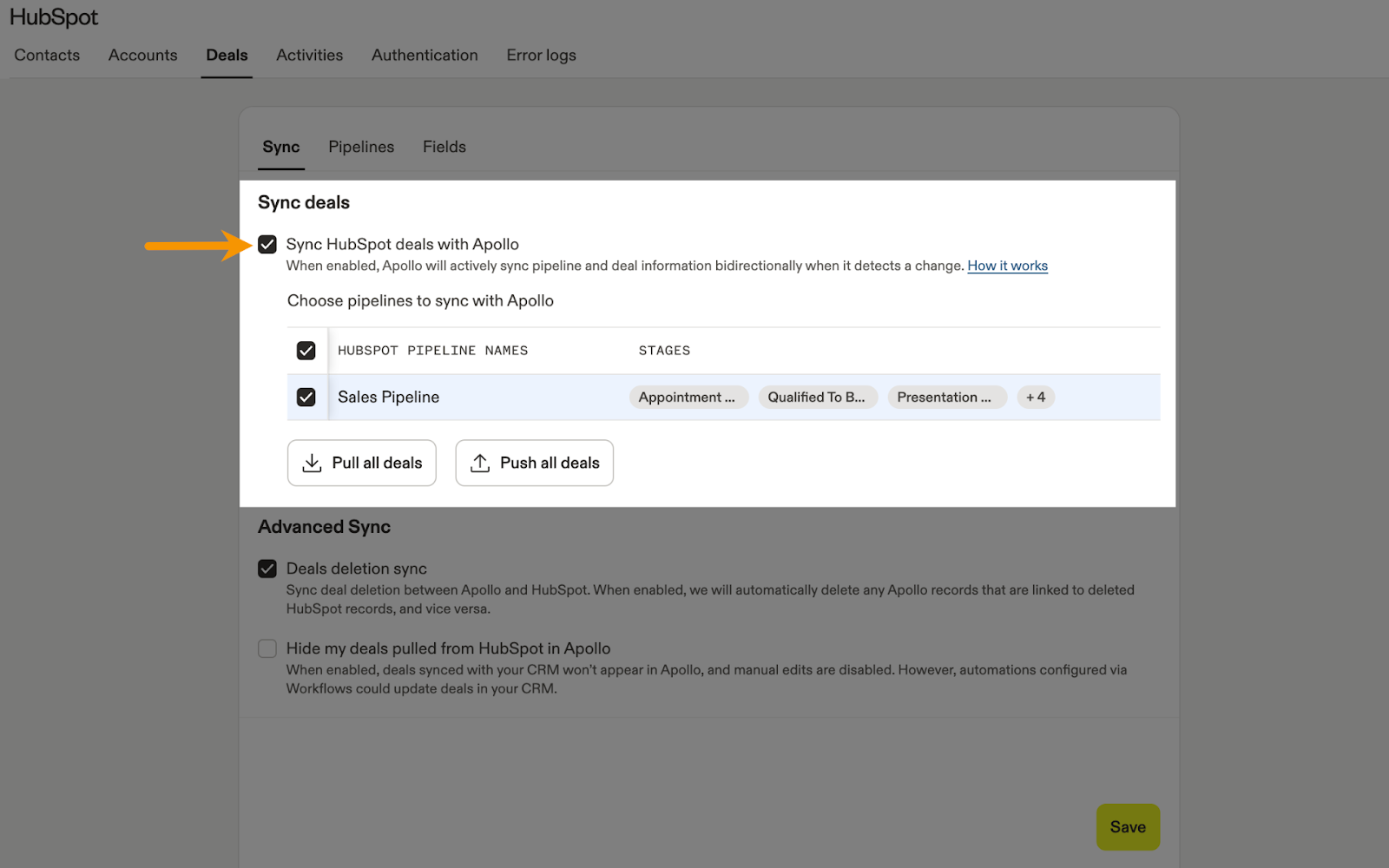 Select Deals. Check Sync HubSpot deals with Apollo to actively sync pipeline and deal information bidirectionally.