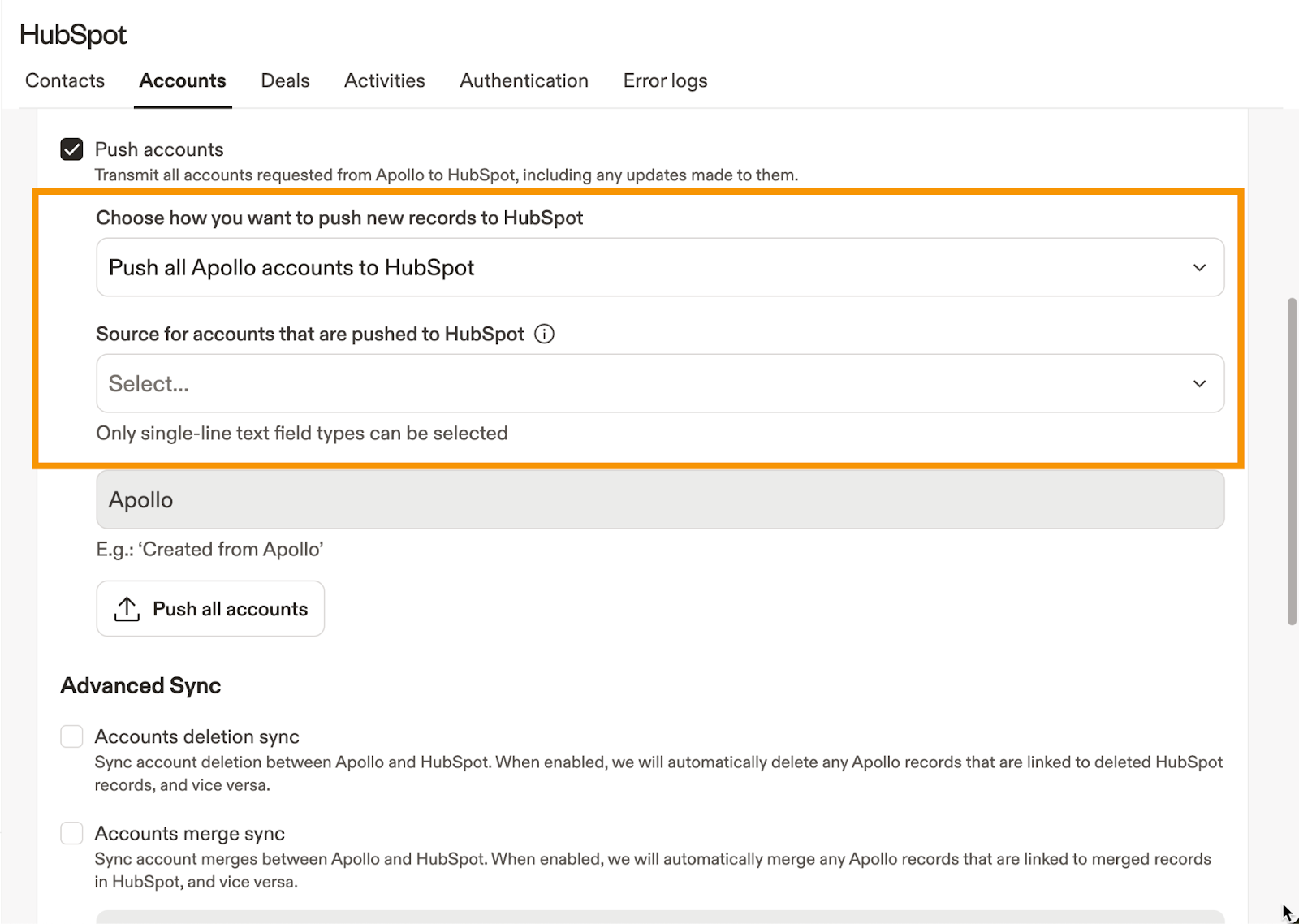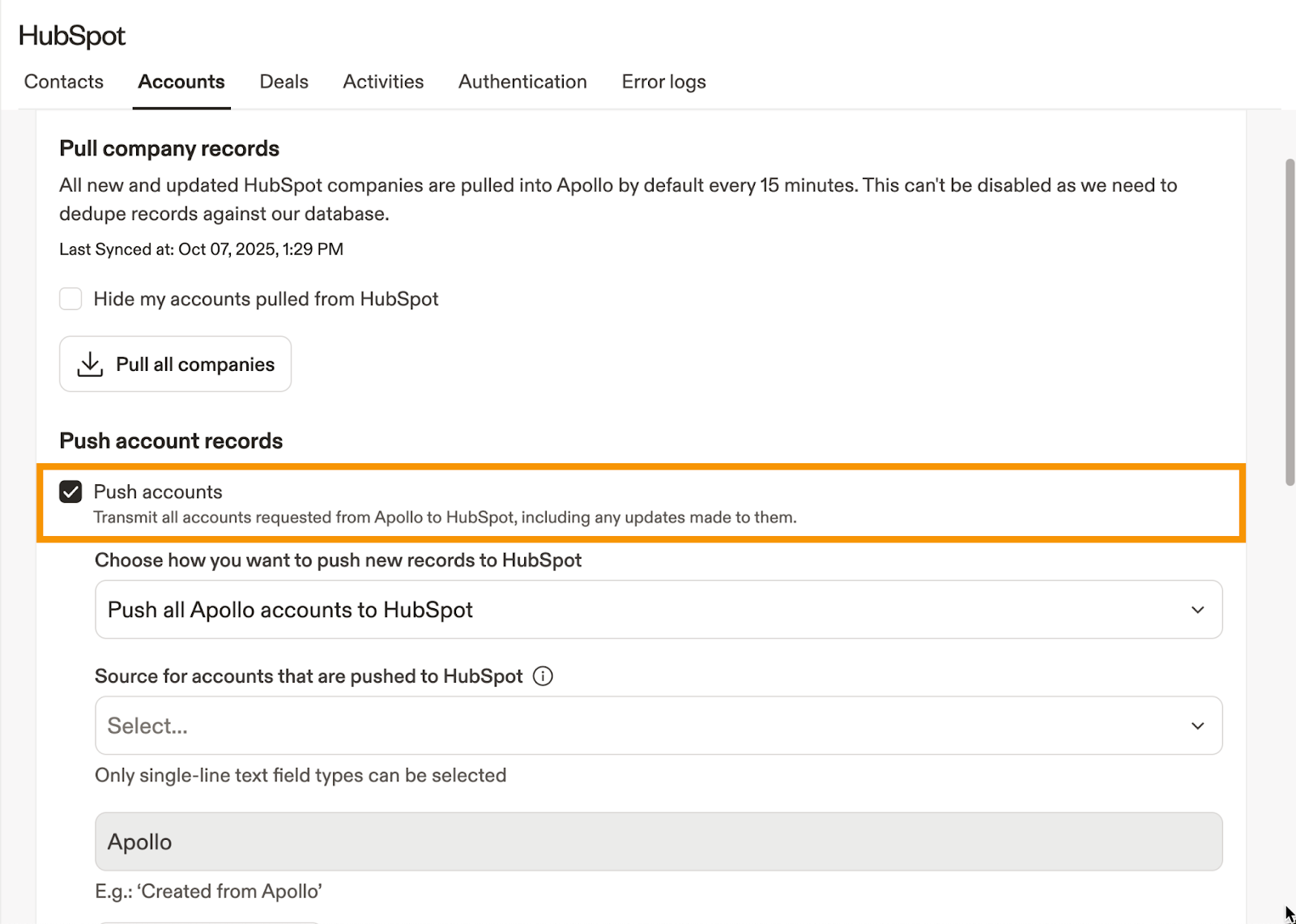 Select Accounts. By default, Apollo auto pushes New accounts to HubSpot. Uncheck Push Accounts to change this setting.