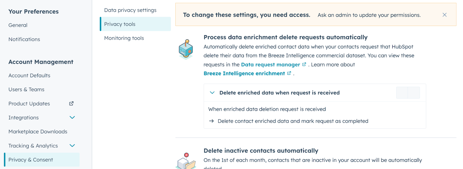 To auto delete enriched data when these requests come in, enable the toggle here: Settings -> Privacy and Consent -> Privacy tools -> Process data enrichment delete requests automatically. Toggle on Delete enriched data when request is received.